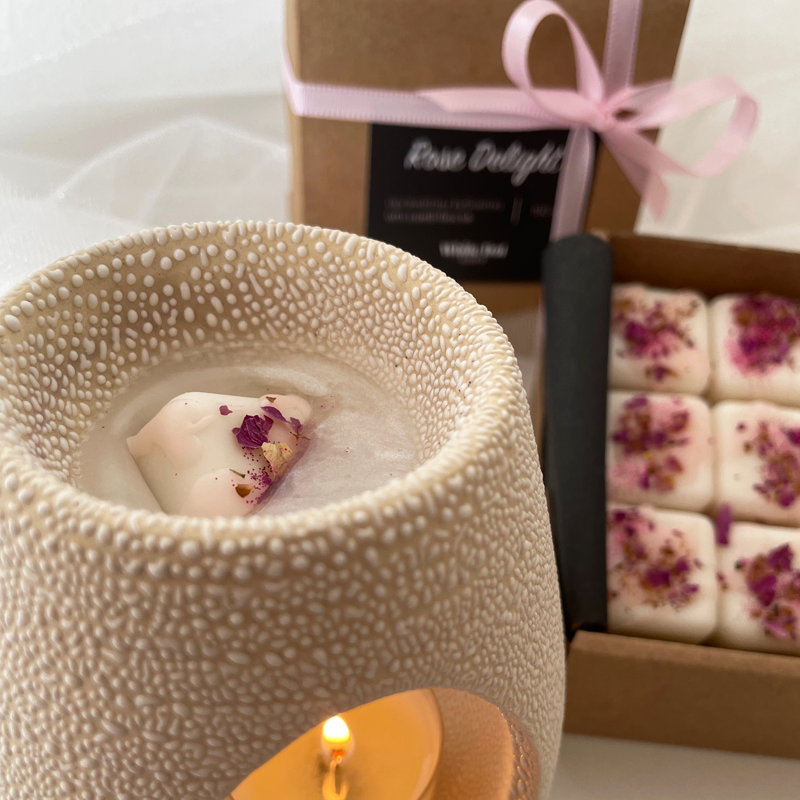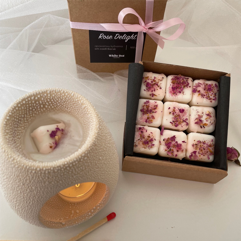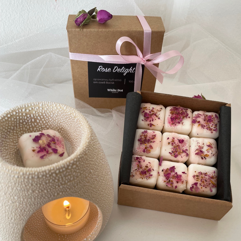 Ароматните кубчета Rose Delight създават усещане за пролетен букет от цветя. Връхните нотки разкриват нежни бергамот и иланг-иланг, които плавно преминават във флорални акценти на роза, люляк, жасмин и лилия. Те придават дълбочина и завършеност на композицията, създавайки хармония и свежест.
